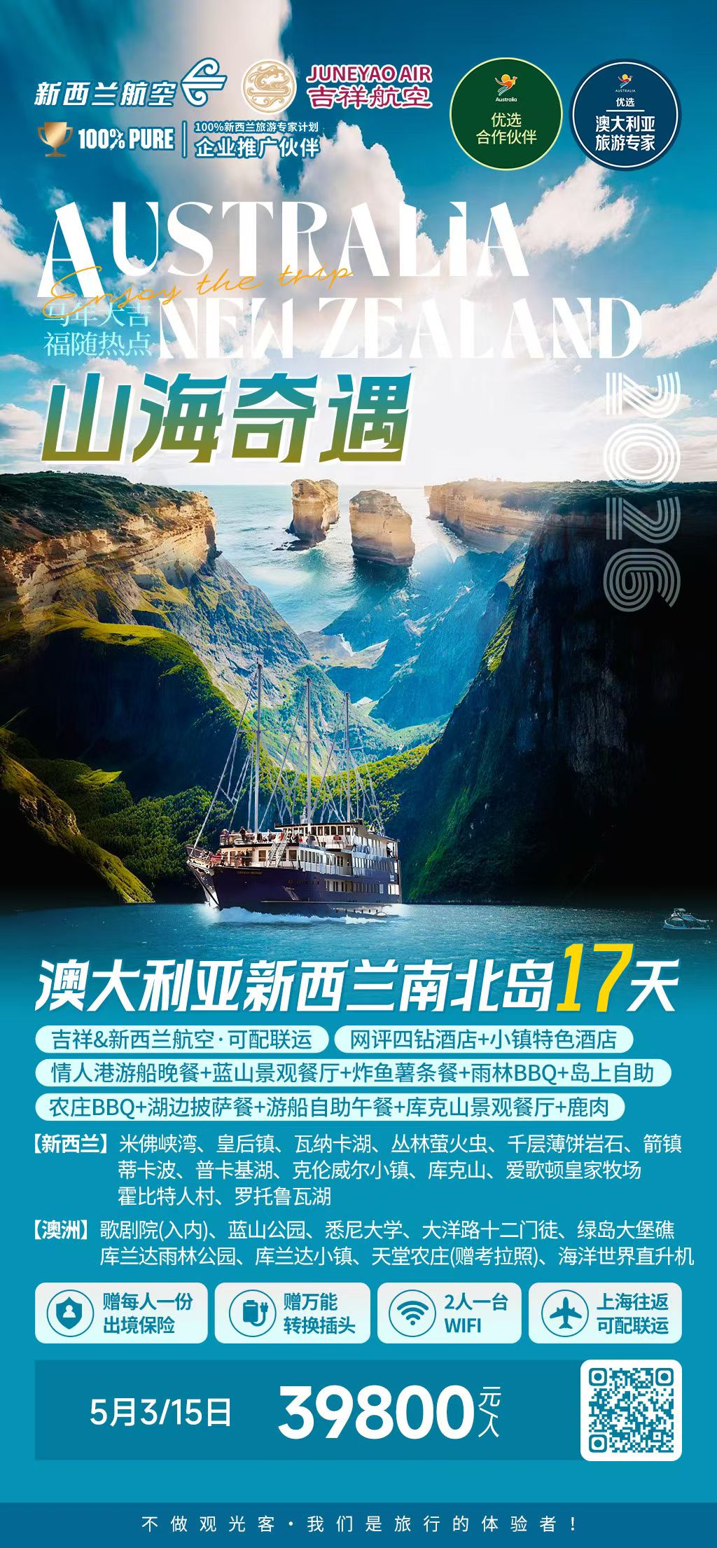 【5月】【山海奇遇】澳大利亚+新西兰 南北岛 17日-悉尼歌剧院 海洋世界直升机 绿岛大堡礁 水陆两用车西岸冰川 米佛峡湾 爱歌顿牧场ZJN