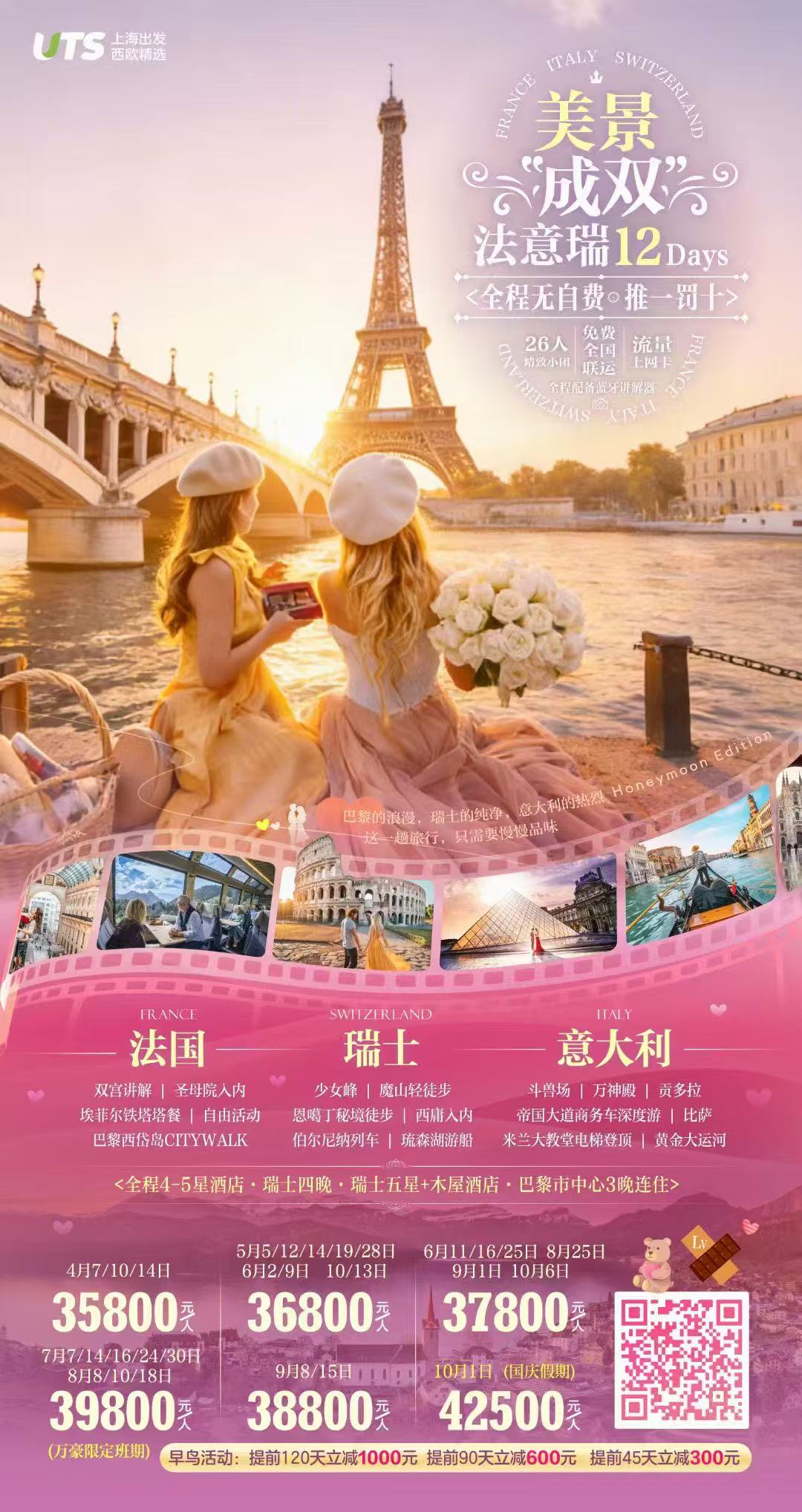 【4-10月含国庆美景成双】法意瑞10晚12日(TGV 火车+少女峰+双宫+双地铁+斗兽场入内+西庸+琉森湖游船+巴黎圣母院入内)SW