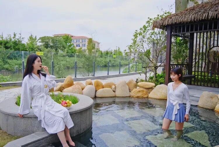 午餐后酒店的庭院内配套【五星半岛温泉】(挂牌138元,费用已含)设有多个温泉池,分为室内和室外两种类型。室外温泉池分布在花园中,游客可以一边泡温泉,一边欣赏周围的自然美景。温泉水质纯净,富含多种对人体有益的矿物质,如硫磺、钙、镁等,具有促进血液循环、缓解疲劳的功效。