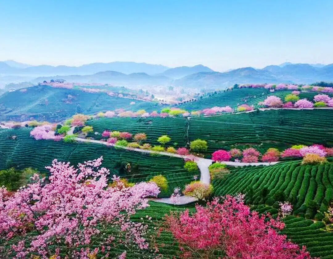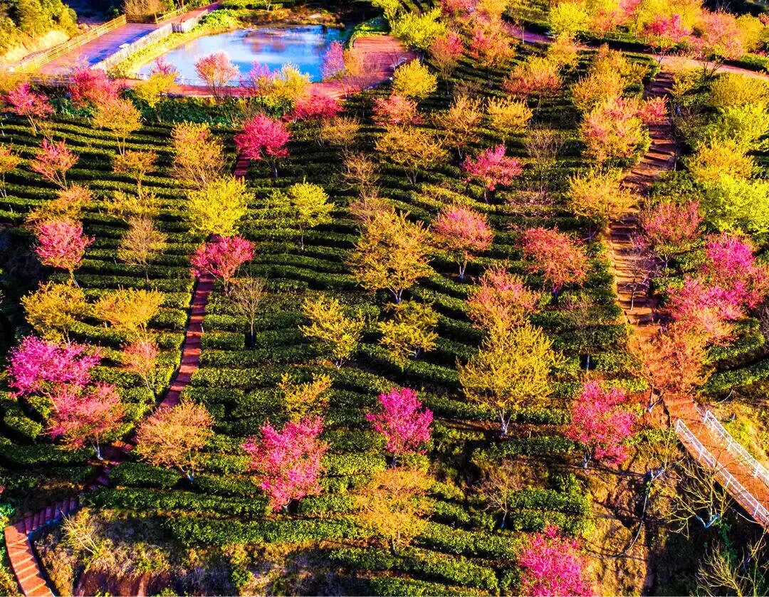后前往【高椅岭茶场樱花园】位于湖南省郴州市苏仙区桥口镇与资兴市交界处,以神奇丹霞地貌为核心,在种植的茶园基础上并栽种了大型的各种樱花树约4000株。其中主要品种包括红粉佳人、中国红、八重樱等观赏品种。和其他樱花不一样,这个茶园樱花香气十足,和茶树的味道混合在一起,形成“神奇丹霞景,茶绿樱花红”的震撼视觉效果,近年已经成为各地区市民踏青赏花的网红打卡地。也是由郴州市高椅岭旅游投资有限公司历经6年时间斥巨资打造的“抬头观花,低头采茶”的樱茶文化园。