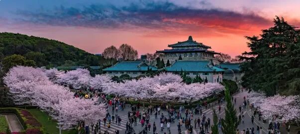 【武汉大学】打卡百年名校,中国最美大学,武大的樱,是春日里裹着书香的浪漫 —— 老斋舍的红墙灰瓦旁,粉白花瓣如云似雪,风过处便落一场轻软的 “花雨”,连带着珞珈山的晨雾与教学楼的书声,都浸在了这温柔的春景里。抬眼是花枝斜倚檐角,低头是落英铺就的轻粉小径,连往来的学子身影,都成了这春樱画卷里鲜活的一笔。