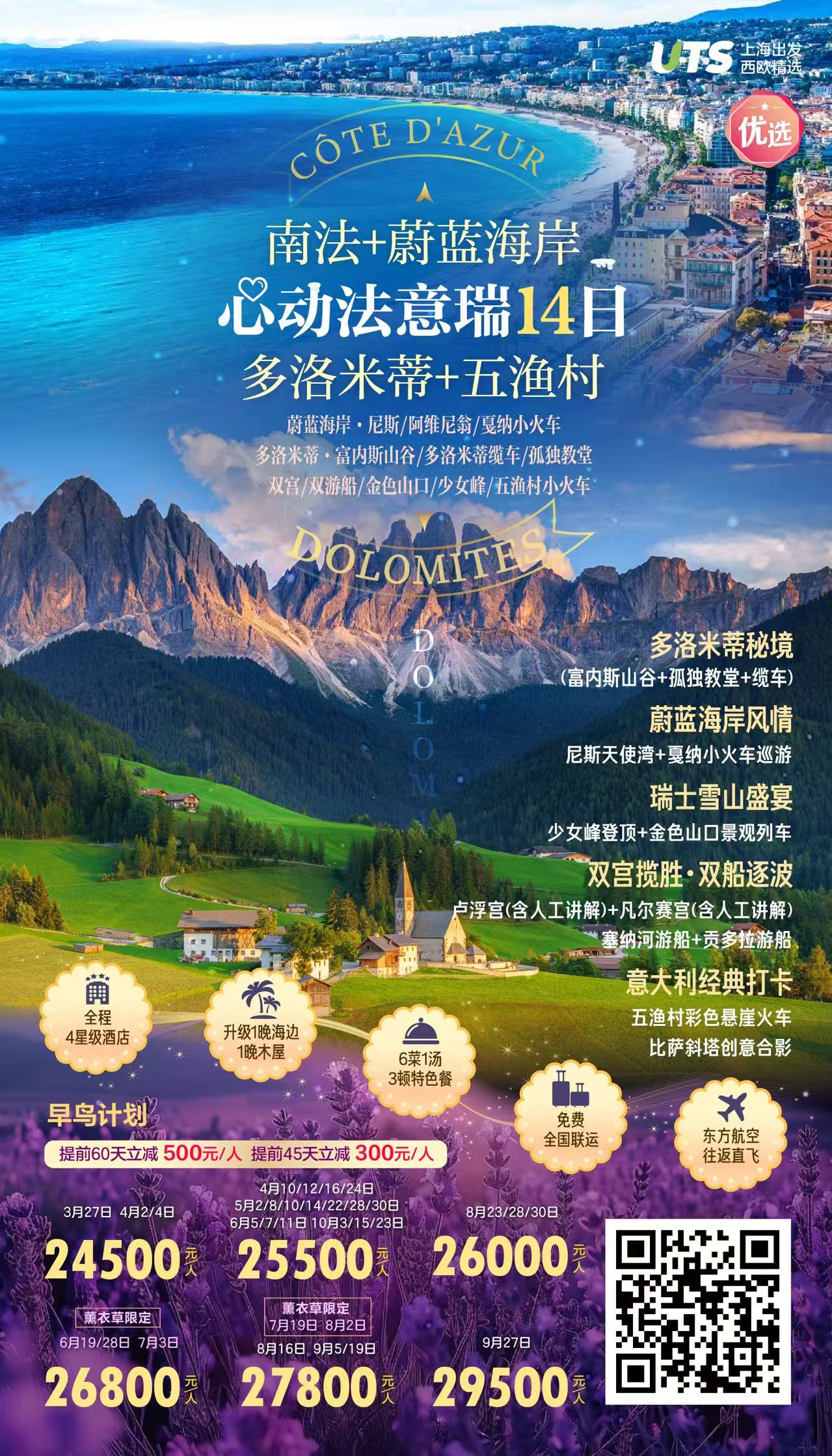 • 【3-10月心动多洛米蒂】法意瑞12晚14日(蔚蓝海岸+尼斯阿维尼翁+戛纳小火车+多洛米蒂缆车+孤独教堂双宫双游船+金色山口+五渔村小火车)SW