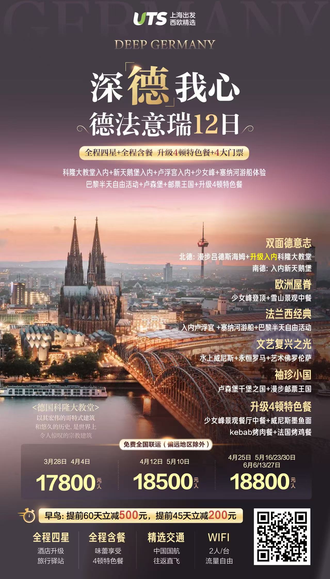 【3-6月深德我心】德法意瑞10晚12日(科隆大教堂入内+新天鹅堡入内+少女峰+卢浮宫入内+塞纳河游船+卢森堡+邮票王国+全程含餐CA)SW