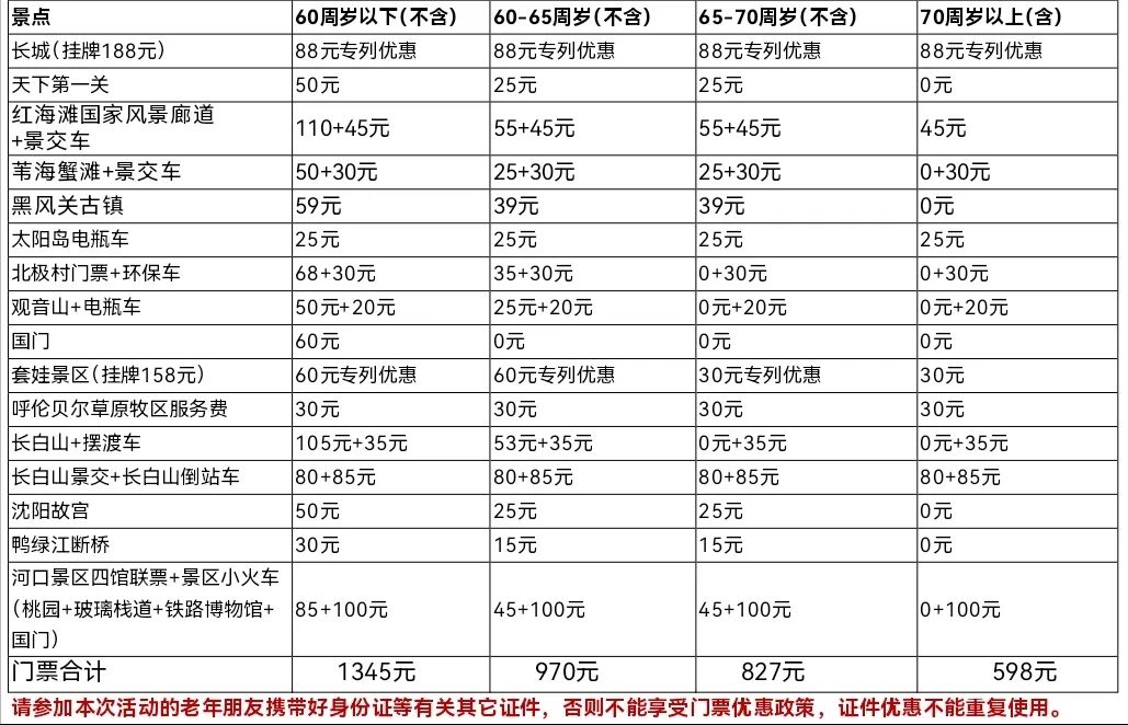 根据各地景区、景点对不同年龄段老年游客的优惠政策,我们把各景区不同年龄段的收费标准列表如下,请各位老年朋友统一在专列上凭借本人身份证上的实际年龄把对应的门票费用交给全陪导游。旅游途中如因身体原因或其他特殊情况,没有参观的景点门票或景区小交通费用在返程专列上由全陪退还(已提前预约门票的除外)。(表格所列门票价格和政策仅供参考、以实际抵达当地旅游景区政策为准!)(请各收客合作社不要提前收取门票费用,以免出现景区门票临时调价给游客造成补差价的麻烦,谢谢配合!!)