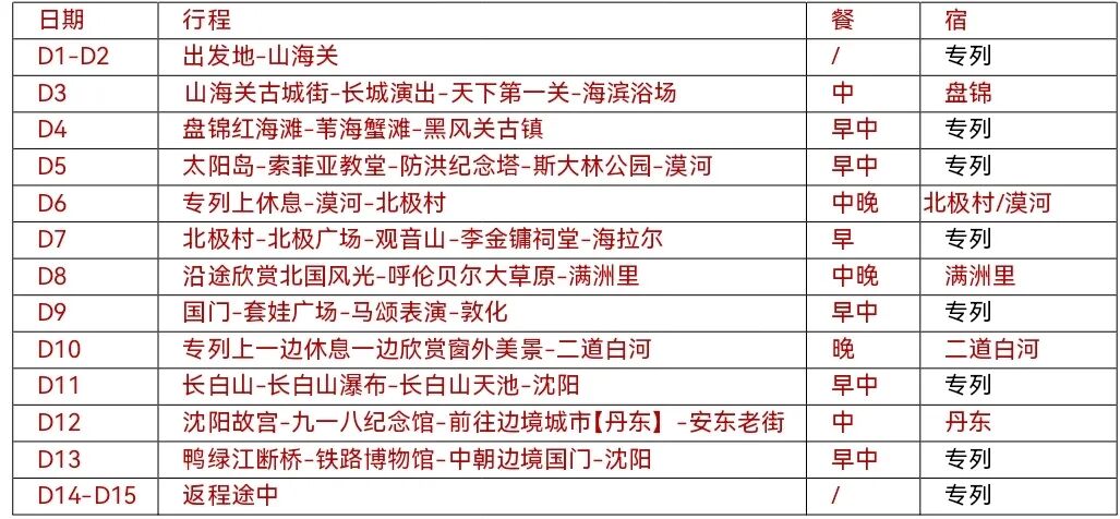 各县市集合前往就近专列停靠站上专列,乘专列前往山海关,开始愉快的东北之旅!(衢州、金华、杭州、嘉兴、上海松江、苏州、无锡、南京、蚌埠、徐州、济南等均可上专列,具体时间、站点以铁路局最终命令为准!)