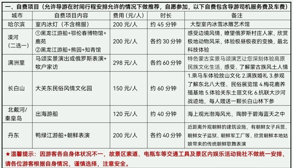 对旅游行程单(我公司专用旅游行程表)中约定的自由活动期间的行程安排,旅行社应提前告知旅游者,保证游客的知情权,并经双方协商一致,作为包价旅游合同的组成部分。以下自费、购物项目为提前告知您,属自愿、自费并提前知晓的活动项目,当地导游及旅行社不会强买、强卖更不会强迫消费,这是您的自由,也是您的合法权益,具体明细如下: