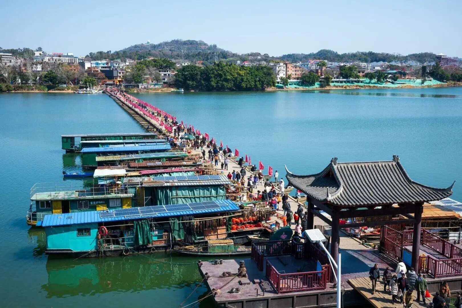 ◈【古浮桥】赣州古浮桥,学名叫惠民桥,又称东津桥、东河浮桥、建春门浮桥。浮桥长约400米,连接贡江的两端,由100多只小舟板并束之以缆绳相连而成,至今已有800多年历史。整座浮桥分为33组,用缆绳把它们连接起来,然后用钢缆、铁锚固定在江面之上。