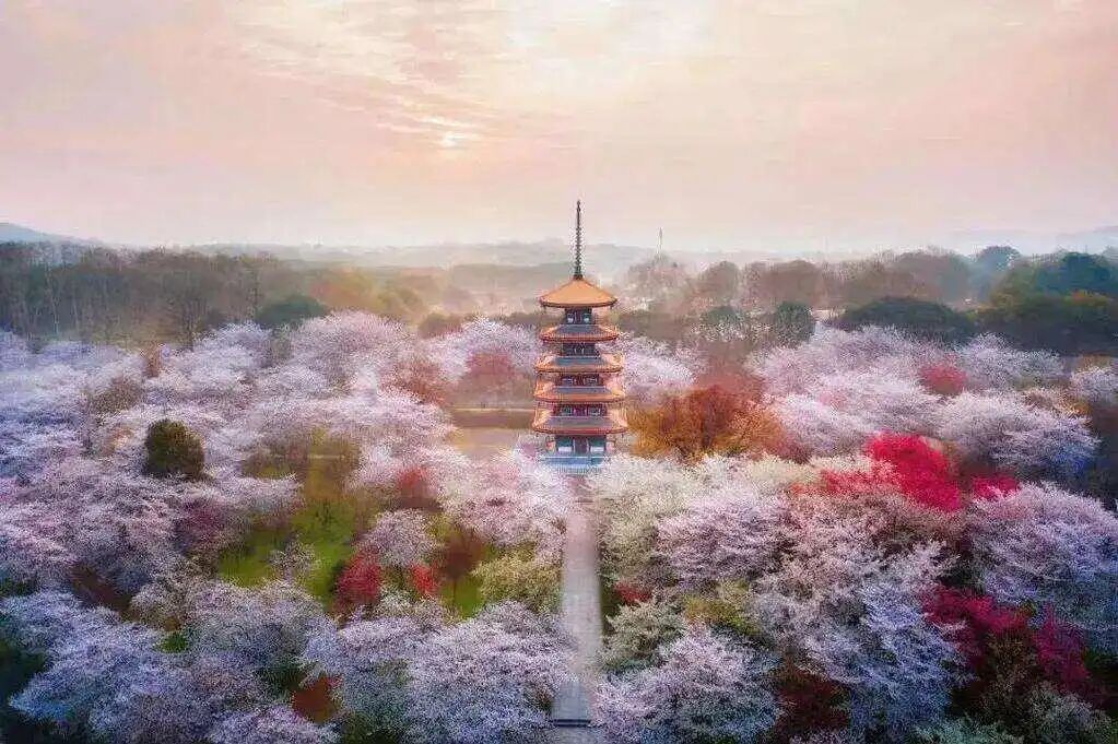 ◈武汉【东湖磨山樱园】(游览时间约2小时)位于东湖梅园近旁的国家 5A 景区东湖磨山景区南麓,占地 260 亩,有樱花树 10000 株。武汉东湖磨山樱园,AAAAA 级景区,园内种植的第一批樱花由邓颖超转武汉东湖。武汉东湖磨山樱园、日本青森县的弘前樱花园、美国的华盛顿州樱花园并称为世界三大樱花之都。东湖樱花园打造了以水系赏樱为主的樱花特色观赏区,形成桥上、亭中、林荫、水岸、溪流、假山、水瀑、空中栈道等多维视角的赏樱情景及人景互动的园林格局,园内有五重塔、曲艳樱艳、华莲池等一系列典雅的唐风建筑。让我们沉浸在花的海洋里,仿佛进入了魅力的童话世界。