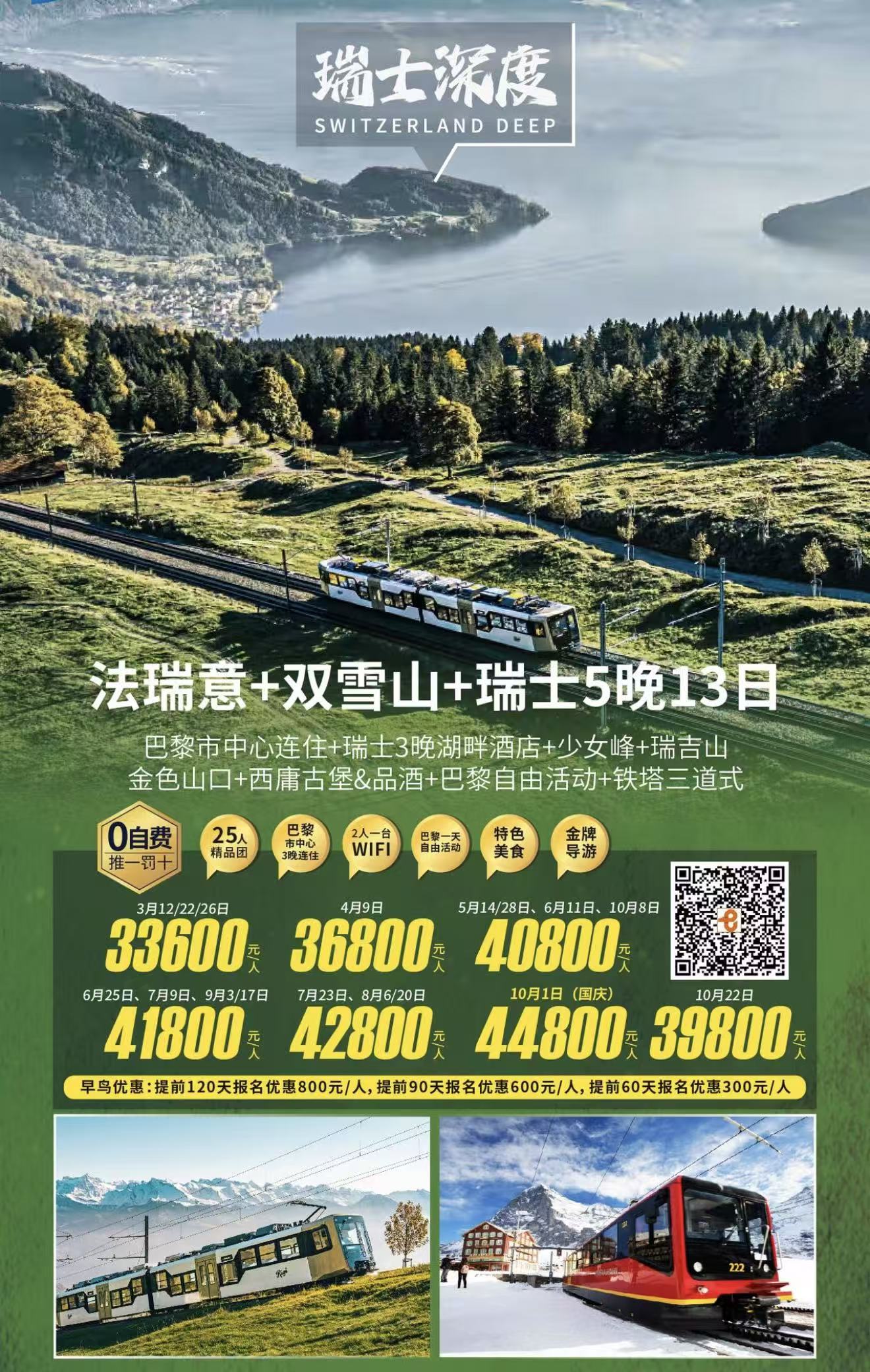 【4-10月精品】法国+瑞士+意大利+瑞士双雪山13天11晚(少女峰+瑞吉山+金色山口+西庸古堡品酒+铁塔三道式)FJY