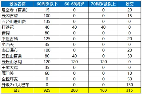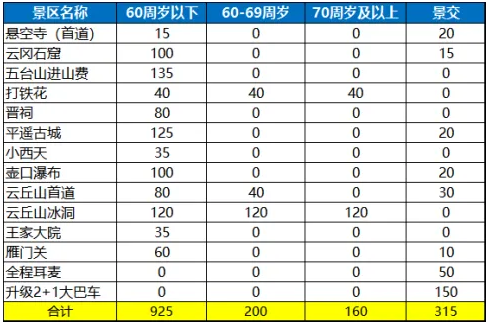 费用包含 FEI YONG BAO HAN 【交通】上海-朔州,朔州-上海,往返经济舱机票(手提7KG+托运20KG)不含机建及燃油;团队机票一经确认,不退不改,如取消收损失1000元/人; 【住宿】全程入住6晚酒店双标间,(山西非一线发达城市,接待能力有限,我社安排当地同级标准中较好酒店,游客报名前可根据我社提供参考酒店名称提前做了解),我社按2人入住1间房核算,如出现单男单女,请补齐单房差以享用单人房间; 【参考酒店】 大同(四钻)*1晚:大同美丽豪酒店或同级 忻州(四钻)*1晚:忻州实习大酒店或同级 平遥(四钻)*2晚:平遥城外新会馆或同级 云丘山(景区精品酒店)*1晚:琪尔康度假村或同级 朔州(四钻)*1晚:朔州艺龙万国酒店或同级 【用餐】全程含6早6正;早餐为酒店含早,正餐40元/人/餐,不含酒水、人数增减时,菜量相应增减,但维持餐标不变,如因客人自身原因不用,费用无法退还; 【门票】行程中所标景点首道大门票(报名时根据实际年龄支付差价,部分景区内小交通自理); 【用车】当地空调旅游大巴车(默认支付必消景交后升级2+1VIP陆地头等舱); 【导服】当地优秀导游服务(自由活动,飞机上无导游陪同); 【儿童】儿童含机票、门票、半餐、旅游车、导游服务(不包含:床位、酒店早餐),其它标准同成人; 温馨提示: 1. 该产品报价为综合优惠价格,已享受景区扶持、老年优惠政策,参团时必须持身份证配合购票,持老年证、残疾证、军官证、导游证、记者证、教师证等优惠证件不能减免门票费用; 2. 持特殊证件或如遇不可抗力因素景点不营业,需要退门票时则按旅行社折扣价当地退现(赠送景点不参加不退费用); 3. 在不减少行程内容及改变接待标准的前提下,我社有权根据实际情况调整行程先后顺序; 费用不含 FEI YONG BU HAN 1. 全程自然单房差3月500元,4-6月600元(全程无三人间或加床,单人报名请补足房差,三人报名可选择入住一间标间退一房差,第三人早餐需自理); 2. 机建+燃油140元/人,报名时一同支付(根据航司最新政策,如遇政策调整,实际以出票为准,多退少补); 3. 门票补差(报名时一同支付): 60周岁及以下:+1240元/人 60-69周岁:+515元/人 70周岁及以上:+475元/人 4. 因交通延阻、罢工、天气、飞机机器故障、航班取消或更改时间等不可抗力原因所引致的额外费用; 5. 酒店内洗衣、理发、电话、传真、收费电视、饮品、烟酒等个人消费; 6. 旅游人身意外保险及航空意外险(建议旅游者购买); 7. 自由活动期间的餐食费和交通费; 8. 因旅游者违约、自身过错、自身疾病导致的人身财产损失而额外支付的费用; 9. 当地参加的自费以及“费用包含”中不包含的其他项目; **行程顺序视当地实际情况而定,遇景点维修等非旅行社控制因素,旅行社保留使用其它相关代替景点的权利!**