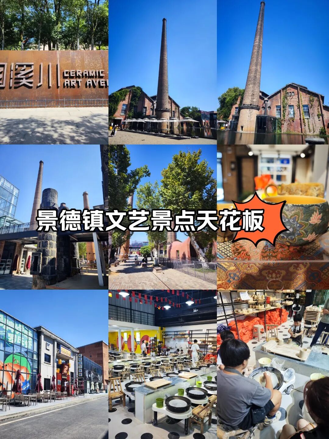 游客打卡之地,错落有致的厂房,古色古香的徽派建筑,现代风格的陶吧酒吧,高耸入云的窑囱,墙壁上保留着各个时代的标语,相映成趣;厂区内穿着工服的瓷工与打扮时尚前卫的参观者川流不息。这里,历史与现实、工业与艺术和谐地交融在一起,成为景德镇陶瓷文化创意产业的一个新地。中餐后乘车前往上饶站,散团,结束愉快的旅程返回温馨的家。