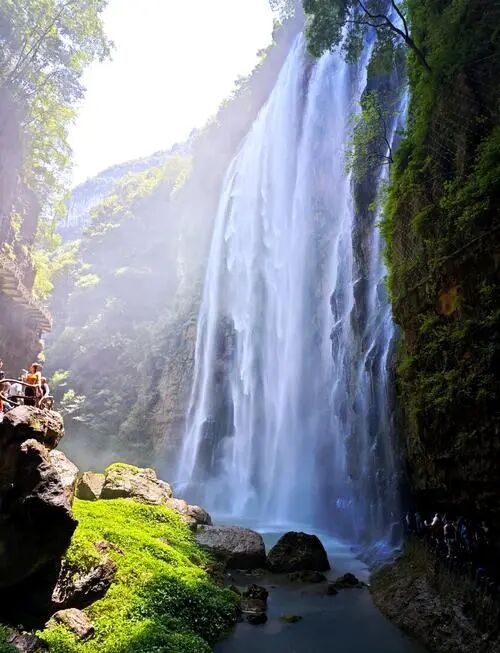 游览“中国十大名瀑”【三峡大瀑布5A景区】,景区自然环境优越,森林覆盖率高达96%以上,步入景区,溯溪而上,满目苍翠、移步换景:寒武天书、桃花湖、秀水湖、逢春桥、嬉水乐园、空中索桥、迎客楠、子母石叠瀑群等30多处景点次第呈现,滴水瀑、虎口瀑、珍珠瀑、一线瀑、响水瀑、双飞瀑等20道天然瀑布接踵而来,令人目不暇接,击节赞叹。三峡大瀑布主瀑高102米,宽80米,水幕从天而降,一条条白练争先恐后,层层跌落,如万马奔腾,蔚为壮观。瀑布既可仰观、俯瞰、远眺、近看,全方位观赏;也可以零距离穿越,沉浸式体验,穿瀑之旅,蹦珠飞玉,惊喜刺激,但见瀑布飞流直下,水花四溅,雾气迷漫,只闻尖叫,不见人影,及至出口,豁然开朗,回首仰望,开怀大笑。当丽日当空,但见一道道彩虹穿过水雾,随着阳光斜照缓缓上浮,若隐若现。你若前行,回头再望,则发现彩虹跟随你的步伐,变得越来越长,最终和瀑布的身宽完全重合,笼罩住了整个穿瀑的栈道,令人称奇。