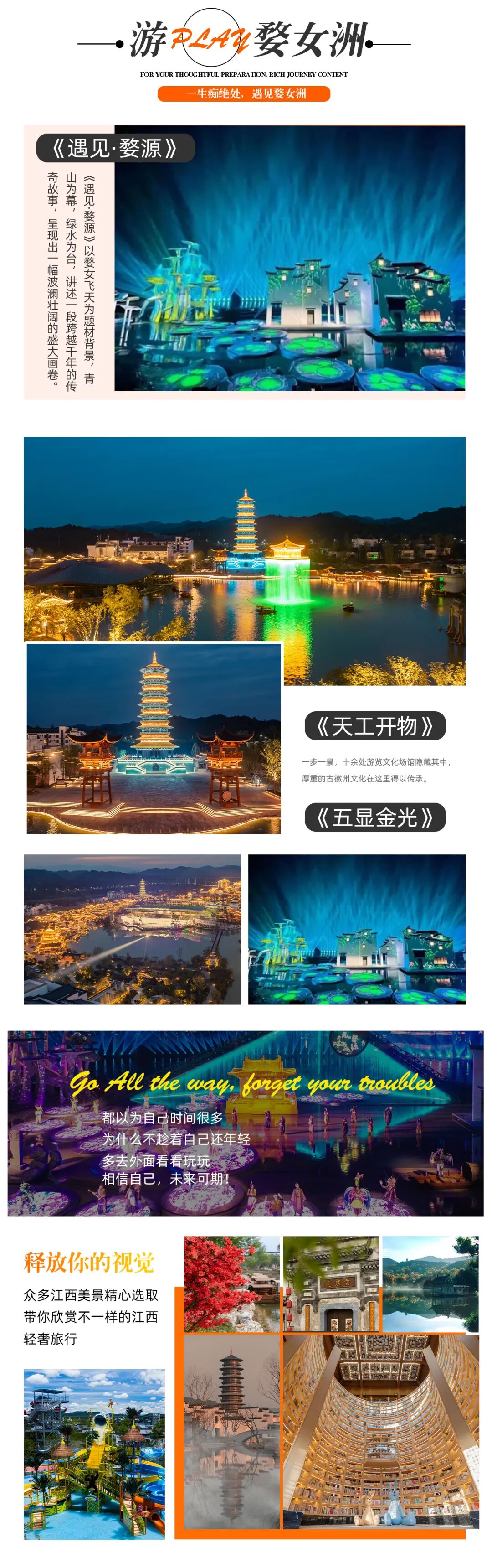 2、门票:含望仙谷+赠送竹筏星江河+江岭或水墨上河+篁岭门票(缆车130元自理)+婺女州(赠送演出)