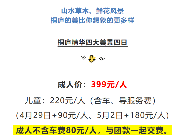 ◇1.2米以下儿童须买儿童价220元/人(只含车位、导服),产生其它费用请自理!以上线路为散客综合报价,房差只补不退;