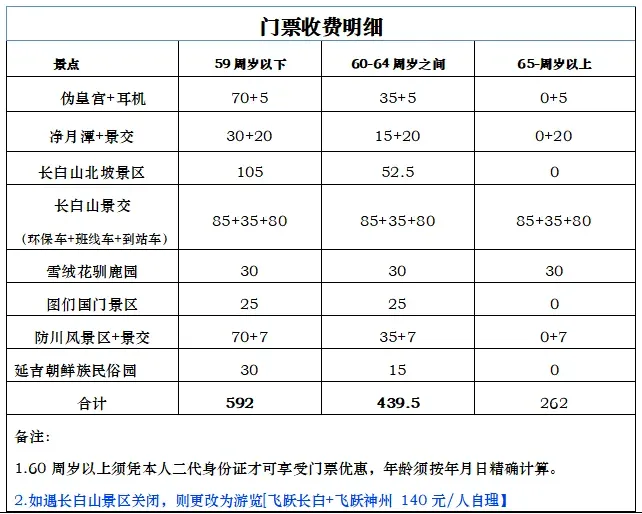 ✈双飞6日销售价格 成人 儿童 房差 班期 3199 2399 660 4月1/8/15/22日 3599 2399 960 4月29日(五一) 3199 2399 660 5月6/13/20/27日 3499 2499 790 6月3/10/24日 3599 2499 860 6月17日(端午节) 备注 以上报价不含机建费和燃油费340元/人,根据政策报名时按实收取! 儿童接待标准 儿童(2-12周岁之间):含往返机票+车费+导服+正餐;不含门票+住宿+早餐,产生自理。 往返航班 去程:南航CZ6156 上海浦东--长春龙嘉 18:40分起飞--- 21:25分抵达 回程:南航CZ6373 长春龙嘉 ---上海浦东 19:45起飞--- 22:35抵达 报名须知 名字+证件号码+全款留位! 详情浏览 Day1 上海-长春(飞机) 用餐:全天敬请自理 住宿:长春[四钻]酒店 ● 上海乘飞机前往北国春城--长春,抵达后入住酒店休息。 参考航班:南航CZ6156 上海浦东--长春龙嘉 18:40分起飞--- 21:25分抵达 【温馨提示】 1.请保持手机畅通,注意接收短信。司机接站会提前一天和您联系。 2.长春市和吉林市,同用一个机场--龙嘉机场,抵达酒店后,报【游客名字】 自行办理入住手续,房卡押金自理。退房时客人自退押金。 DAY2 长春→二道白河(约5H车程) 用餐:酒店早餐、山珍宴、敬请自理 住宿:长白山[四钻]温泉酒店 ●酒店内享用自助早餐。 ●游览5A级【伪满皇宫博物院】(游览时间约60分钟),这里曾是清朝末代皇帝爱新觉罗溥仪充当伪满洲国傀儡皇帝时的宫殿,他从1932年到1945年间曾在这里居住。如今这里还原了溥仪曾经生活和工作的环境,展示着大量的史料和文物,让人们了解末代皇帝的前半生以及侵华日军的罪证。 ●游览5A级【净月潭】(游览时间约90分钟),净月潭有 “绿海明珠”“都市氧吧”“亚洲第一大人工林海” 之称,与台湾日月潭为姊妹潭,是吉林八景之“净月神秀。这里因形如弯月而得名,来这里,你可以顺着潭边一路溜达、在水库大坝边欣赏湖光山色,也可以漫步于林间的木栈道,呼吸纯净的空气,享受森林浴。 ●乘车前往长白山下第一小镇--二道白河镇(车程约5小时)。 ●入住【长白山温泉酒店】,泡长白山温泉! Day3 二道白河→长白山北坡→二道白河 用餐:酒店早餐、敬请自理、敬请自理 住宿:长白山[四钻]温泉酒店 ●游览【长白山北坡景区】(景区游览约5小时),长白山不一样的季节,不一样的美。换乘环保车进入长白山风景区,登【长白山天池】俯瞰天池全貌;长白山四季皆有令人叹为观止的景色,让你感叹不虚此行。 ★游玩亮点★ ★【长白山天池】“佛光”天池云开雨霁,落日余晖下天池灯杆山上空突然出现一道美丽的彩虹,看上去如同传说中的佛光,令人赞叹不已,当然前提是你足够幸运,就算没有看到天池的美景也足以让你惊叹很久!夏融池水比天还要蓝;冬冻冰面雪一样的白,被16座山峰环绕!自1962年出现“天池怪兽”的新闻,天池还有“龙潭”、“海眼”之说,所谓“海眼”说是其与大海相通达,常有神龙出没。吸引众多游人前来观赏,(门票+小交通自理) ★【长白瀑布】天池唯一的出水口,天池圣水径流,1250米,世界上最短的河流“乘槎河”在天豁峰和龙门峰间有一狭道池水溢出,飞泻成长白瀑布,汇聚成东北三省著名三江“中朝界江-图们江、中朝俄三国界江-鸭绿江、贯穿两省母亲江-松花江”犹如两条银龙交汇落入凡尘。 ★【聚龙温泉群】长白温泉有“神水之称”,可舒筋活血,驱寒祛病,在黑风口滚滚黑石下面,分布在1000平方米地面上的温泉群。它距离震耳欲聋的长白瀑布不到二里,奔腾咆哮的白河檫边而过。它以绚丽的色彩把周围的岩石、沙砾染的金黄、碧蓝、殷红、翠绿,闪烁着五光十色,散发着蒸腾热气,格外愉悦游人的眼目。 ★【绿渊潭】因岳桦阴翳、潭水碧绿深窘而得名。绿渊潭瀑布飞流直下,最高落差达26米,瀑水落于巨石而四溅,而后流入深潭。每逢雾起,潭上水雾弥漫,与高山岳桦、旷古巨石浑然而一体,美不胜收,恰似人间仙境。水体幽深、水面舒展,融蚀着周围岳桦树的荫绿,潭面薄雾轻浮,幽绿泛蓝,镶嵌在寂静的山峦中,如临瑶池仙境! 【小贴士】 1.如因天气原因长白山关闭则更改为游览【飞跃长白实景演艺】,门票自理 2.长白山景区门票实行预约制度,因此如您有【优惠证件】请务必预订时在订单中备注,否则大门票已提前出好,当日可能无法二次预约,也【无法退还门票优惠部分】,敬请知悉。 3.长白山环保车为一票通用,各景点间需换乘. 4.长白山景区内移动信号不稳定,请一定遵守与导游或司机师傅约定的集合时间,准时集合,以免耽误行程. 5.导游不跟随进入天池景区,且天池景区是否开放受天气状况影响,无法保证每位贵宾都能一睹天池神秘面容,天池也在等待她的有缘人哦~~ 【重要说明】 1. 长白山景区海拔较高,气候变幻莫测,偶尔遇到恶劣天气,长白山景区为安全起见,会临时关闭,均为当天视天气情况临时通知,无法预判。若景区整体关闭,则根据实际情况,我们为您调整其他景区或娱乐项目,费用多退少补,还请您多多理解。 2. 若长白山景区内个别小景点关闭(如长白山天池绿渊潭/长白瀑布/小天池,小景点开放情况以景区实际公告为准,如遇关闭,恕无法提前通知,还请您多多谅解),但门票和小交通等已经使用,则无费用退还,敬请知晓。 ●游览【长白山恩都里水广场】(游览时间约90分钟),是长白山北坡新晋文旅地标,以满族文化为核心,融合新中式建筑风格与沉浸式夜经济业态的休闲度假商旅社区,满语中“恩都里”意为“神”或“神圣