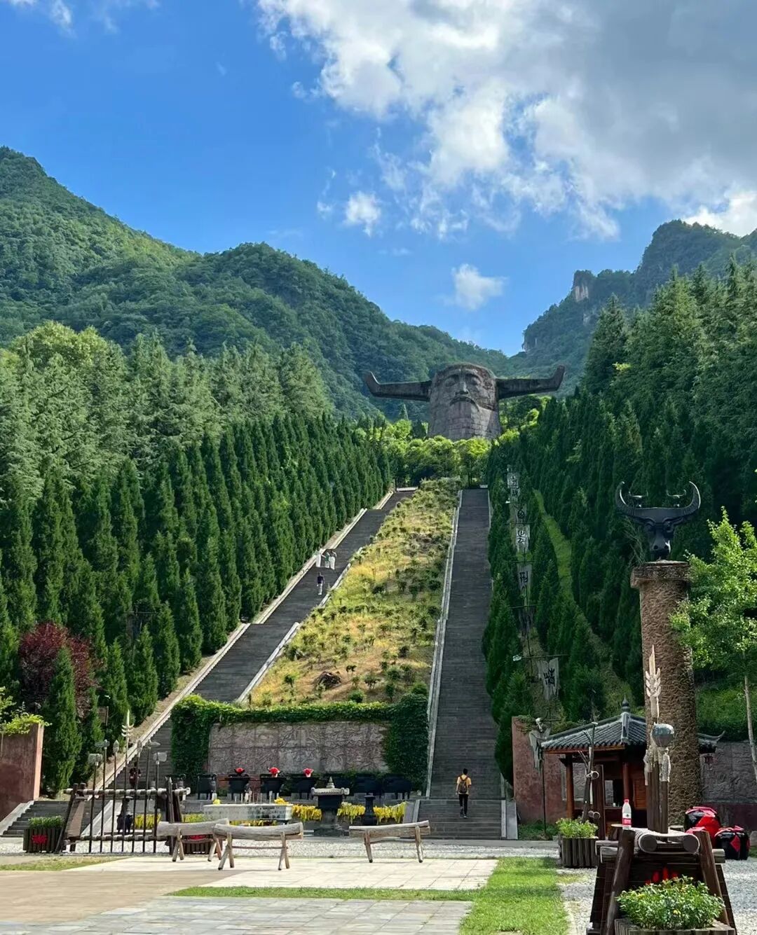 ▲早餐后乘车前往游览【神农祭坛】(车程约30分钟,游览约40分钟),整个景区分为主体祭祀区、古老植物园、千年古杉等。祭祀区分天坛、地坛,依山而建,主体建筑为巨型牛首人身神农雕像。